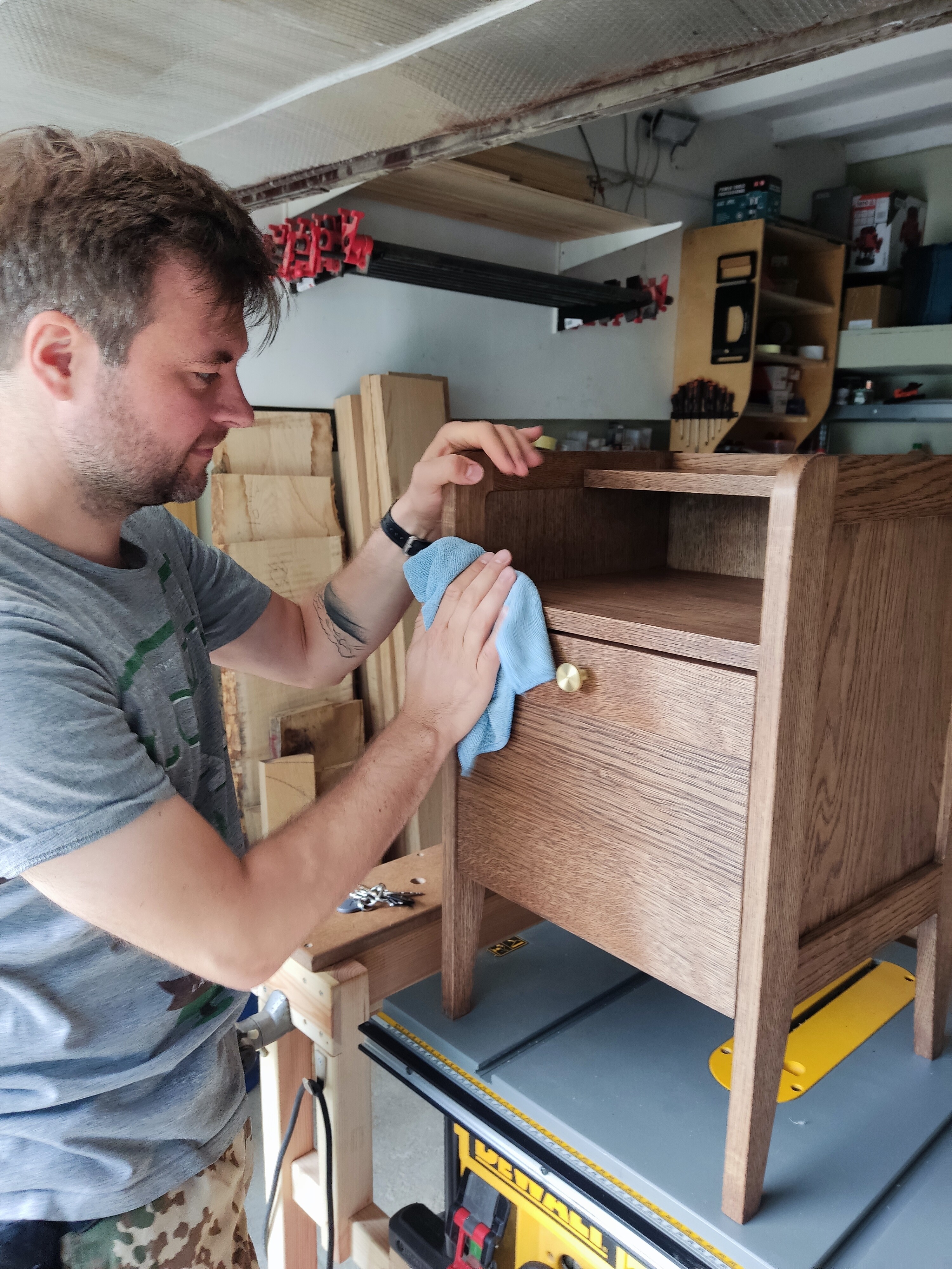 Cześć! Mam na imię Marcin i jestem założycielem rzemieślniczej pracowni stolarskiej Na pniu. Pochodzę z malowniczych Mazur, gdzie spędziłem dzieciństwo, pokochałem las i nauczyłem się doceniać przyrodę. Do Łodzi przeprowadziłem się na studia na Wydziale Mechanicznym Politechniki Łódzkiej, które ukończyłem z tytułem magistra inżyniera w 2012 roku. Po ponad dekadzie pracy jako inżynier postanowiłem zamienić swoją wieloletnią pasję w zawód. Zostałem stolarzem i cieszę się z tej decyzji każdego dnia.